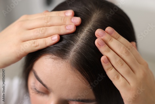 Naklejka premium Woman examining her hair and scalp on blurred background, closeup