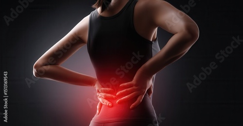 Naklejka premium Woman experiences lower back pain, holding her back for relief. Bright red highlights the area of discomfort against a dark backdrop.