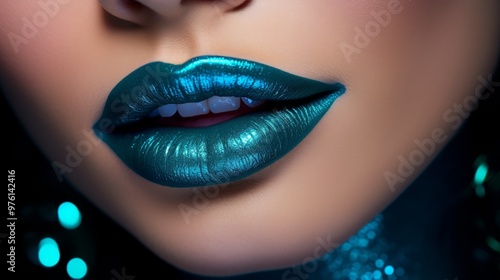 © mehaniq41, Fototapeta premium Woman face in glowing blue makeup paint. Neural network ai generated art