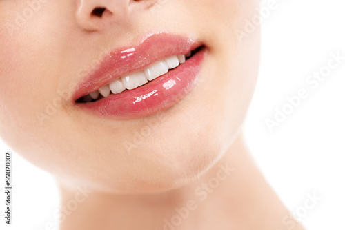 © Tasneem/peopleimages.com, Obraz premium Woman, face or skincare lips with makeup cosmetics, mouth dermatology and healthcare wellness on white background. Zoom, beauty model and happy smile with facial lip gloss product for hydration glow