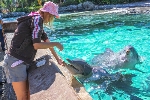 © bennymarty, Obraz premium Woman feeds a laughing dolphin in a pool.