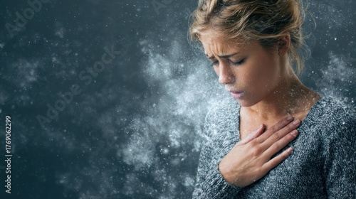 © Thanyaporn, Obraz premium Woman Feeling Cold with Snow Surrounding Her in a Dramatic Atmosphere