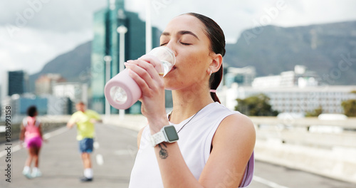 Naklejka premium Woman, fitness and drinking with water bottle in city for workout break, rest...