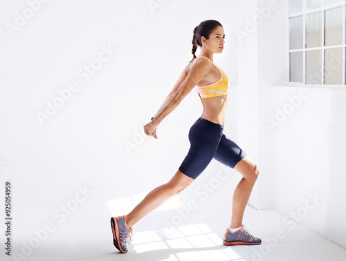 Fototapeta premium Woman, fitness and stretching with body in exercise. workout or training at...