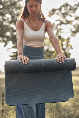 Naklejka premium Woman folding and unfolding yoga mat in the park during sunset sunrise time.