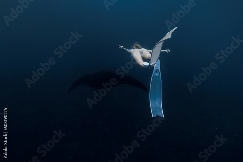 Obraz premium Woman freediver with white fins swim with manta ray. Freediving with manta rays on deep