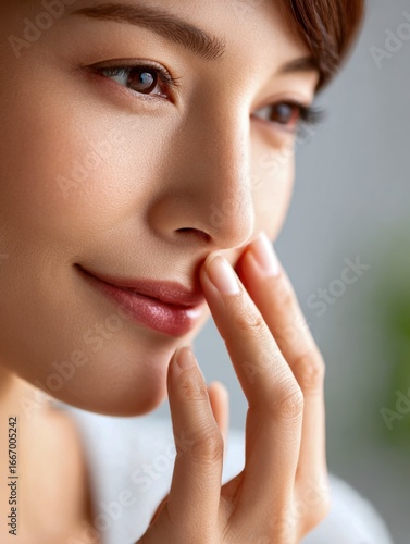 © BrandwayArt, Obraz premium Woman gently touching her face in natural light