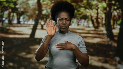 Fototapeta premium Woman gesturing oath in park with trees, demonstrating a serious expression,...