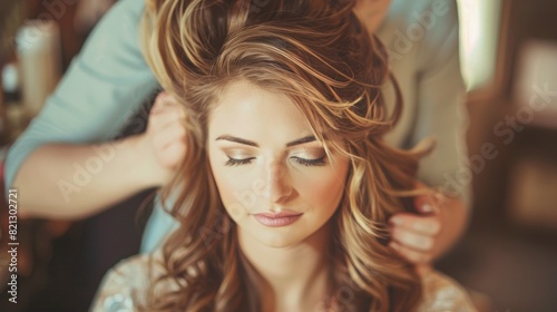 Fototapeta premium Woman Getting Hair Styled by Hair Stylist