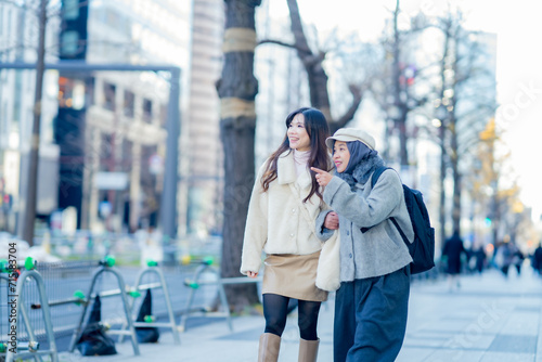 © maya1313, Naklejka premium woman girl tourist Two Asian friends but different religions, one of whom is a Muslim girl. Walking tour of the city, city view, traveling in Japan Tokyo. with fun She is traveling in the city area.