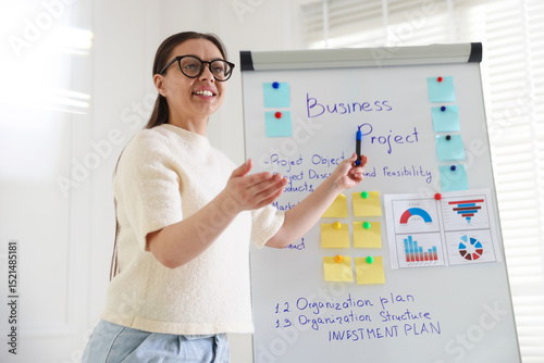 Fototapeta premium Woman giving public speech near whiteboard indoors, low angle view