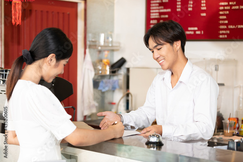 © offsuperphoto, Fototapeta premium woman guest write signature for check in hotel from receptionist on paper