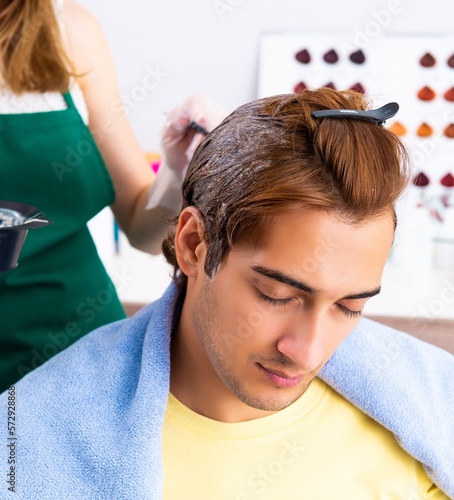 © Elnur, Naklejka premium Woman hairdresser applying dye to man hair