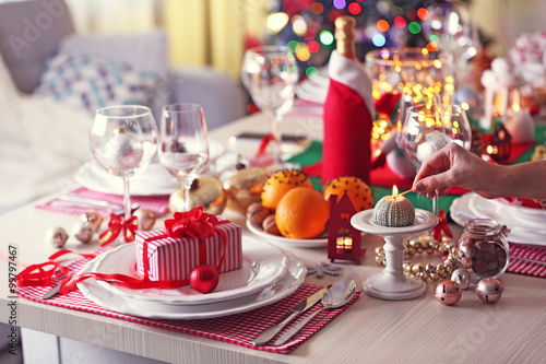 Fototapeta premium Woman hand lights a candle on holiday table setting