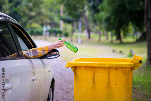 Fototapeta premium Woman hand picking up garbage plastic and Glass bottles for cleaning at park