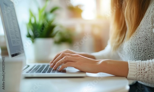 Fototapeta premium Woman hand typing, online work interface