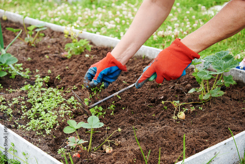 © Artem, Naklejka premium Woman handling young germs on kitchen-garden bed.