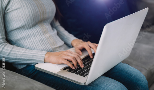 © Nuttapong punna, Naklejka premium Woman hands is typing on a laptop