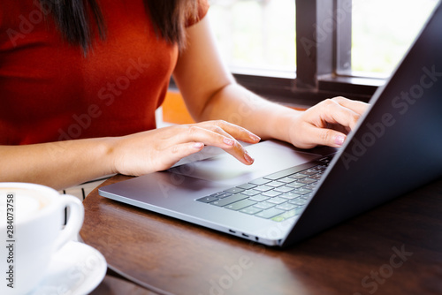 © PORNCHAI SODA, Fototapeta premium woman hands typing on laptop keyboard. Woman working at office with coffee