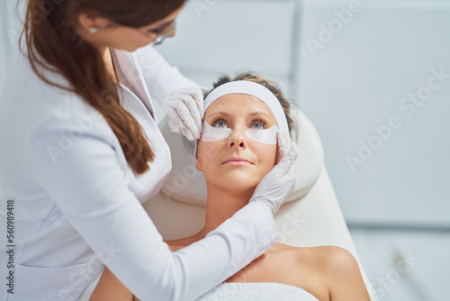 Fototapeta premium Woman having cosmetology eyebrows treatment in beauty salon