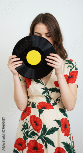 Obraz premium Woman hides face with record in studio portrait