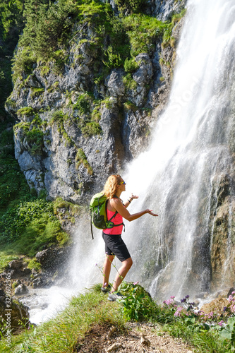 © k5hu, Naklejka premium Woman hiker touching water drops at Dalfazer waterfall, Austria.