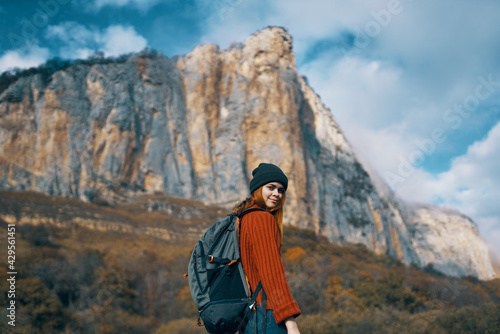 Naklejka premium woman hiker walk nature mountains travel freedom