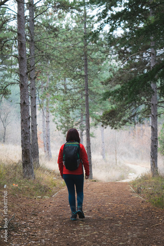 © Nikola Solev, Fototapeta premium Woman hiking in the forest