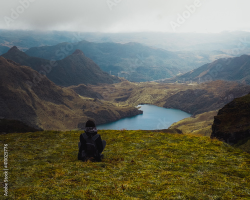© Estefano Hidalgo, Naklejka premium woman hiking in the mountains and watching the landscape