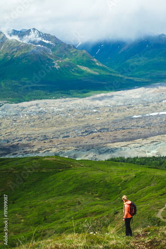 Naklejka premium Woman hiking in the mountains. Enjoying the view. Active life. Alaska range. Glacier.