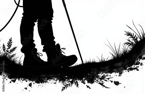 Naklejka premium Woman hiking with trekking poles in silhouette against a white background with plants and soil