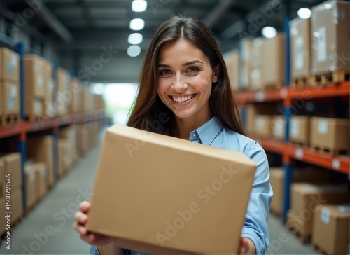 © Murilo, Fototapeta premium Woman holding a cardboard box in a warehouse