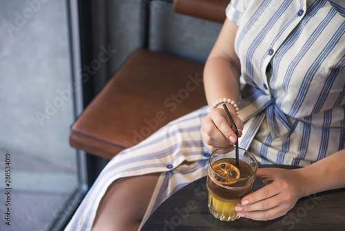 Obraz premium Woman holding a cold summer cocktail with coffee beans