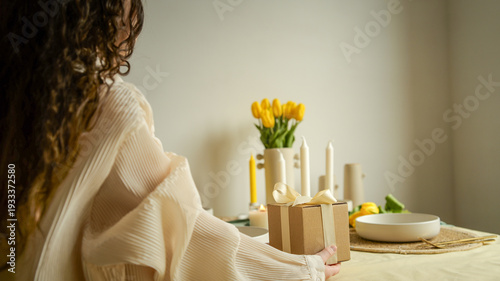 Fototapeta premium Woman holding a gift box with a ribbon on a table with tulips and candles