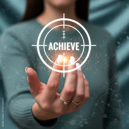 Fototapeta premium Woman holding a glowing target with the word achieve in the center...