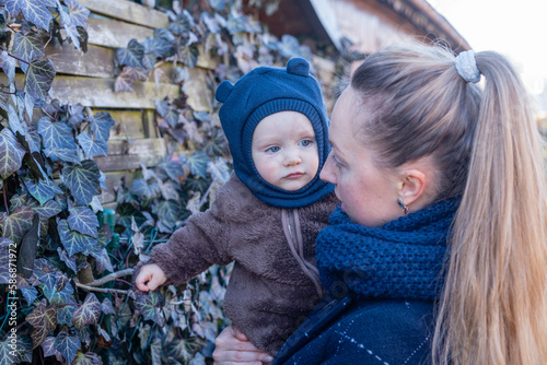 Obraz premium Woman holding baby in her hands. Mother and son.
