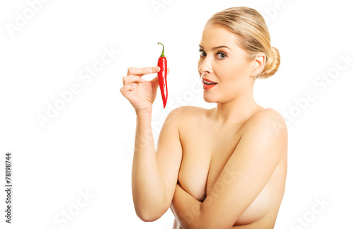 © Piotr Marcinski, Fototapeta premium Woman holding chilli, looking at the camera