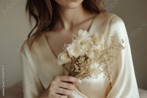 © ChrisKuz, Naklejka premium Woman holding dried flowers in an elegant cream outfit