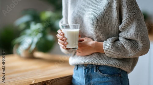 Fototapeta premium Woman holding glass of milk experiencing discomfort, concept of lactose...