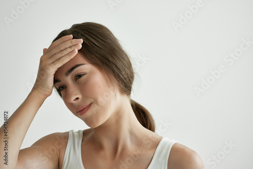 Fototapeta premium woman holding her head migraine health problems depression dissatisfaction