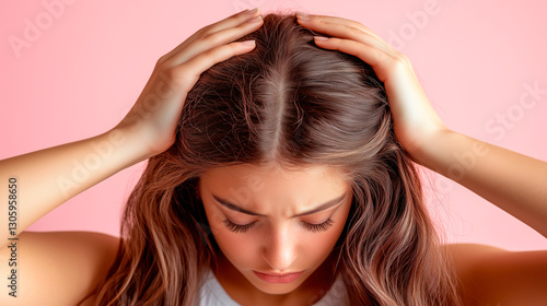 © Focalfinder, Fototapeta premium Woman Holding Her Head with a Distressed Expression, Looking Down Against a Pink Background – Low Self-Esteem Concept
