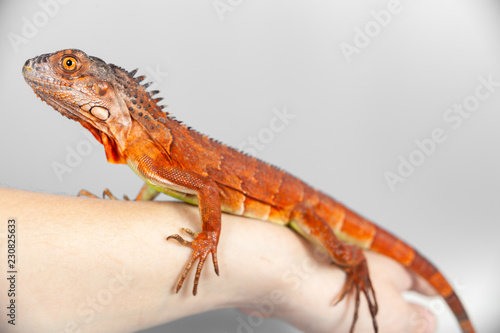 © shanshinyury, Naklejka premium Woman holding orange red colorful iguana in her hand, closeup, on grey background