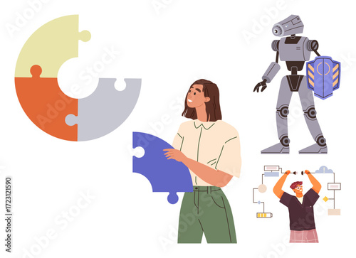 Obraz premium Woman holding puzzle piece, humanoid robot with shield, and man connecting flowchart. Ideal for teamwork, innovation, automation, creativity, strategy robotics futuristic themes. Vibrant flat