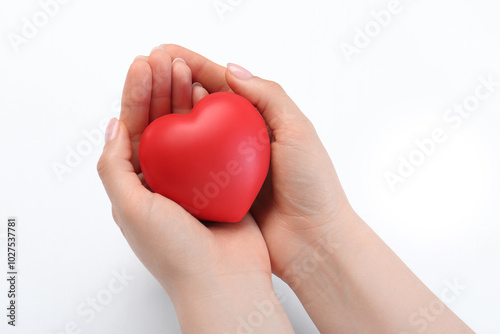 Obraz premium Woman holding red heart on white background, closeup