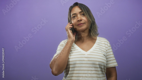 Fototapeta premium Woman holding smartphone to ear while checking messages and then smiling in studio purple backdrop; casual conversation content.