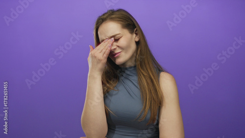 Obraz premium Woman holds hand to forehead in a purple studio setting wearing a sleeveless...