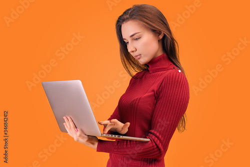 © EverGrump, Naklejka premium woman holds laptop and sends an email best friend