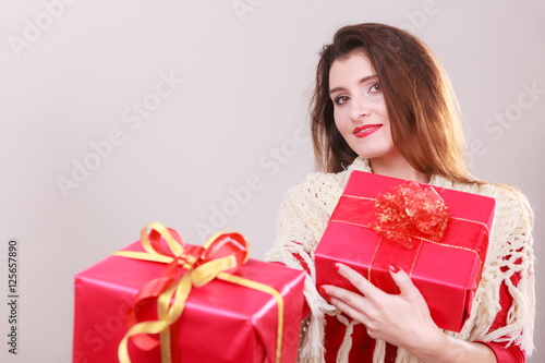 © Voyagerix, Fototapeta premium Woman holds red christmas gift boxes