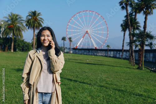 Fototapeta premium Woman in a beige coat smiles while talking on her phone in a sunny park, green grass and a distant ferris wheel creating a casual outdoor lifestyle scene
