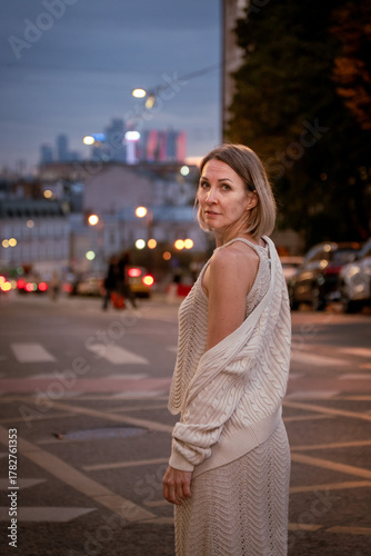 Fototapeta premium Woman in a beige knitted outfit walks through a city street at dusk,...